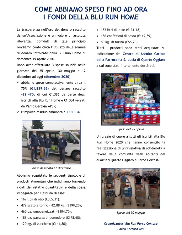- abbiamo speso complessivamente circa il 75% (€1.839,66) del denaro raccolto (€2.470,di cui €1.386 da parte degli iscritti alla Blu Run Home e €1.084 versati da Parco Certosa APS);