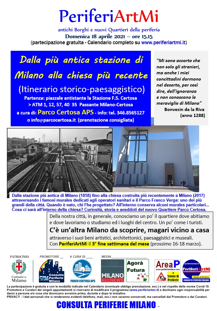 Grazie alla collaborazione tra la Consulta delle Periferie milanesi e Parco Certosa APS, si è svolto domenica 18 aprile un “sopralluogo accompagnato” all’interno del nostro Quartiere dal titolo: “Dalla più antica stazione di Milano (Certosa) alla più recente parrocchia realizzata nella nostra città (Pentecoste)”. Un ringraziamento a Massimo (Gruppo “I vecchi amici di Quarto”) che, davanti a un gruppo di una quarantina di persone, opportunamente distanziate, ha ricordato quanta “storia” ha attraversato gli angoli della nostra periferia e raccontato diversi aneddoti accaduti nel tempo a Quarto Oggiaro. Visti gli apprezzamenti a tale iniziativa da parte dei partecipanti e la buona riuscita dell’incontro, tale programma sarà ripreso domenica 23 maggio a partire dalle ore 15.30. L’appuntamento è fissato nel piazzale davanti alla più vecchia stazione ferroviaria esistente a Milano (Milano Certosa, 1858). Il programma prevede cinque tappe, all’interno del nostro Quartiere e si concluderà con una sorpresa all’interno della Parrocchia Pentecoste (che è l’ultima chiesa costruita dalla Curia sul suolo milanese, nel 2017). Il percorso guidato attraverserà i viali del Parco Franco Verga. Per poter partecipare al sopralluogo è obbligatoria la prenotazione, da effettuare attraverso l’invio di una e-mail a info@parcocertosa.it